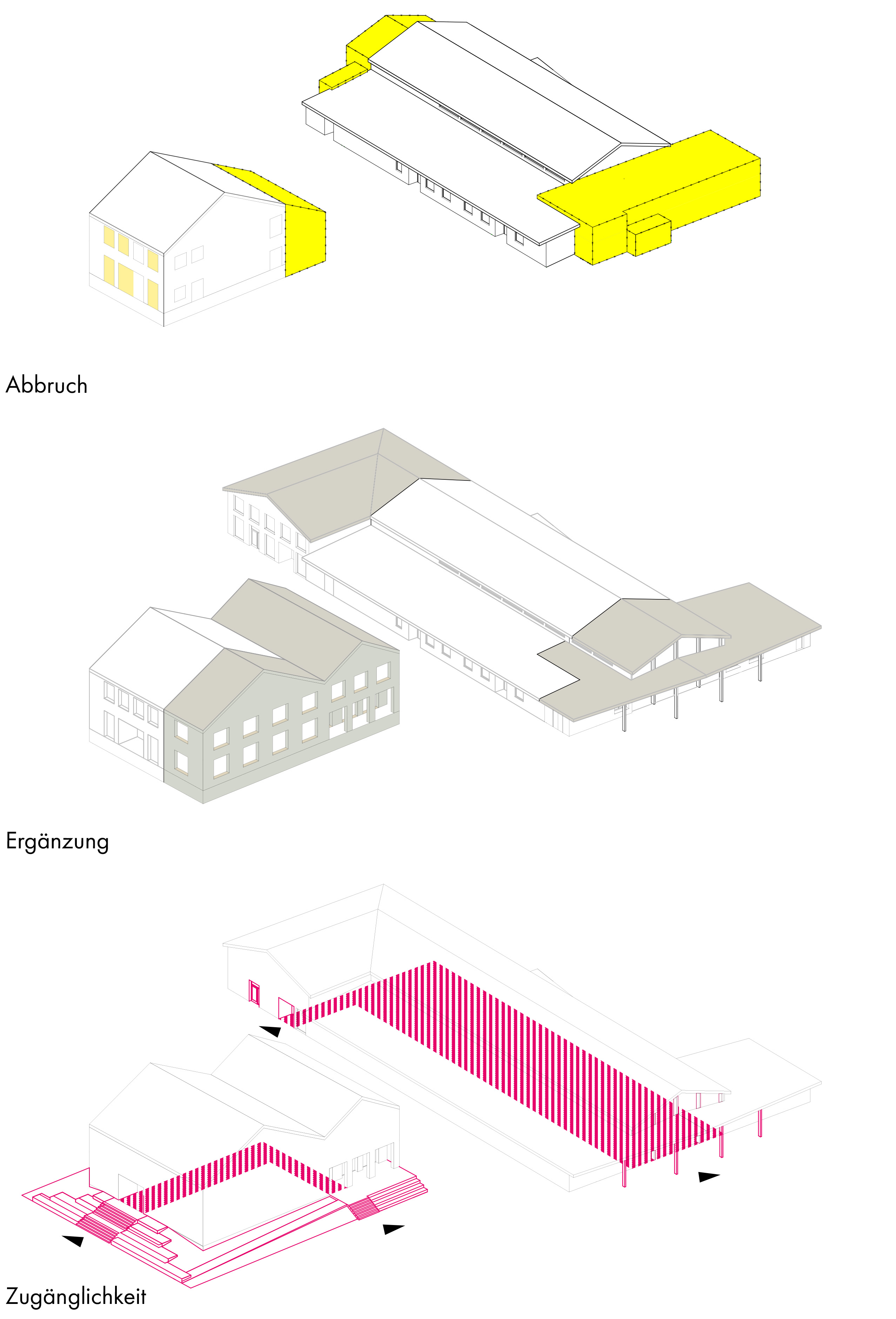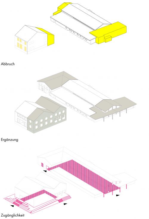 Die Mehrzweckhalle wird größtenteils erhalten, erfährt aber eine Neuordnung. Zentrale Rolle dabei spielen die beiden neu geschaffenen Foyers mit ihren Vorplätzen.