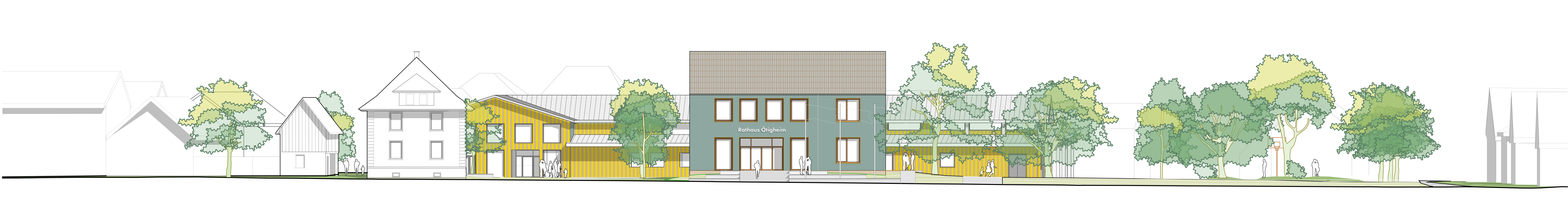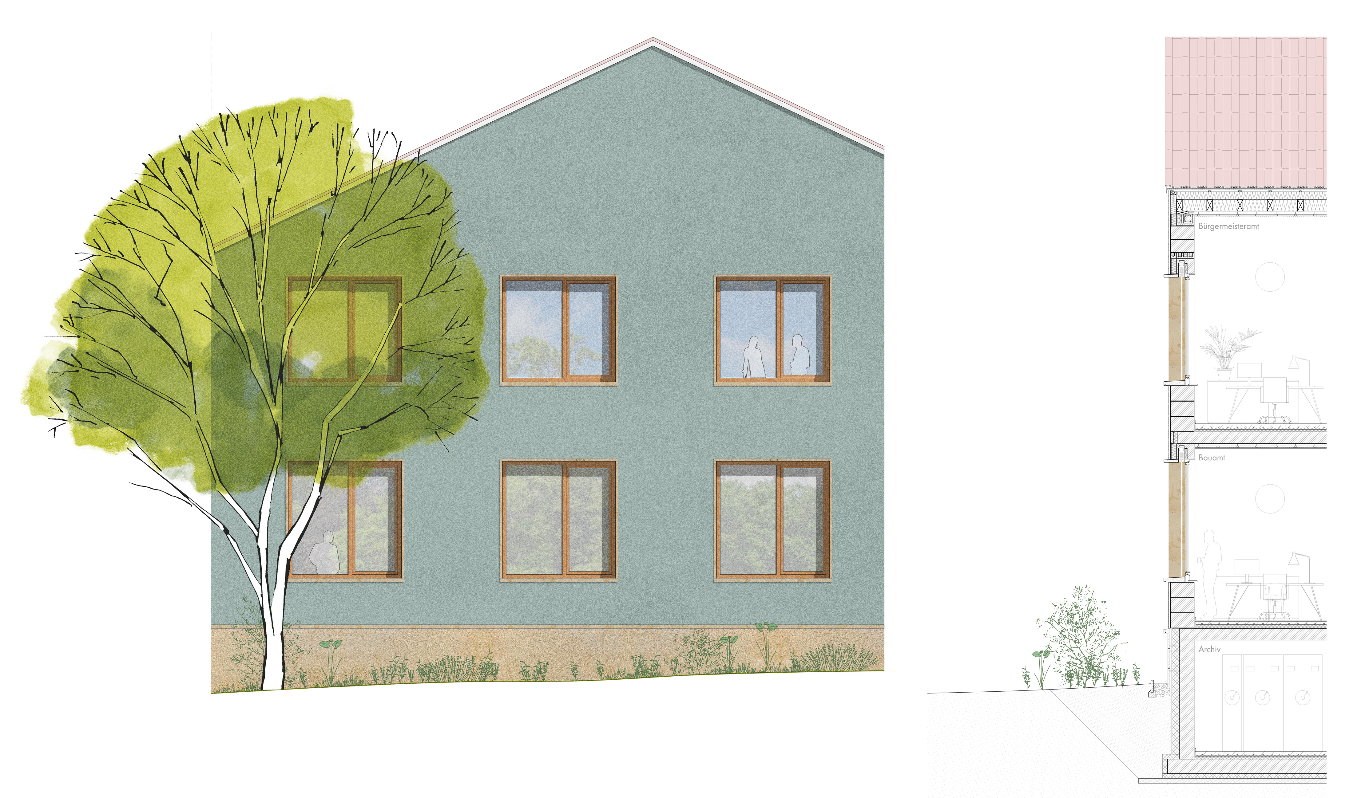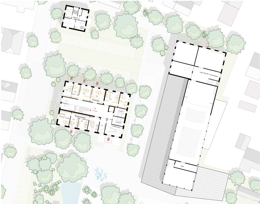 Das Rathaus wird umfassend umgebaut und erweitert, um den zukünftigen Raumbedarf zu decken. Der Anbau aus den 1960er-Jahren wird zurückgebaut, nach Süden und Osten entsteht ein Erweiterungsbau mit eigenständigem Giebel, der dem Rathaus eine prägnante, zugleich ortsbildgerechte Silhouette verleiht. Eine neue, großzügige Mittelzone rund um das Treppenhaus verbindet Haupt- und Nebeneingang und ordnet die Funktionsbereiche. Über eine Rampe auf der Südseite werden alle Bereiche barrierefrei erschlossen. In der Gestaltung knüpft das Rathaus an lokale Bautradition an: Sockel und Fensterlaibungen aus ortstypischem Sandstein sowie eine mineralische Putzfassade sorgen für ein vertrautes Erscheinungsbild, Langlebigkeit und reduzierte CO2- und Folgekosten, sodass Alt- und Neubau zu einem stimmigen Ganzen verschmelzen.