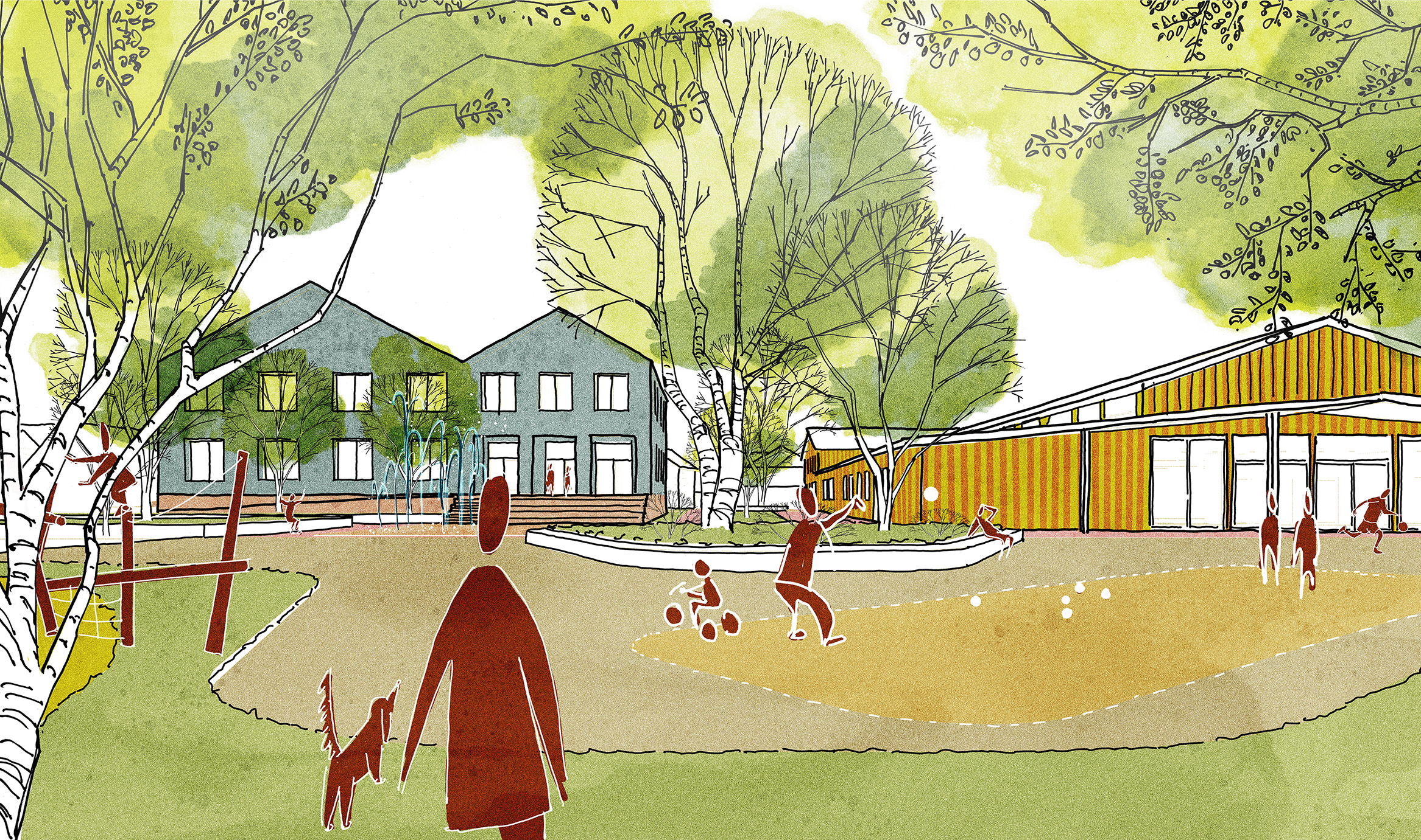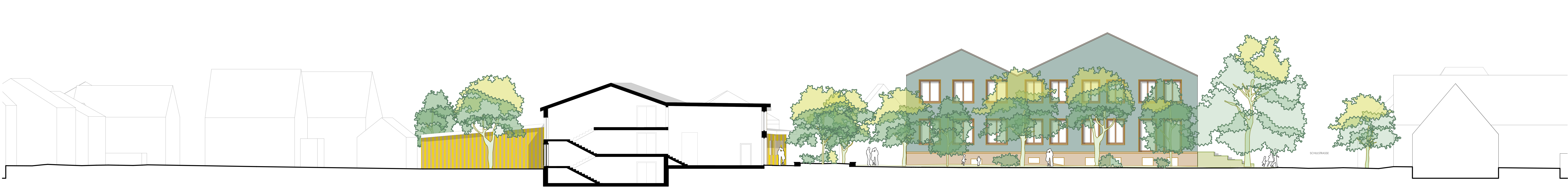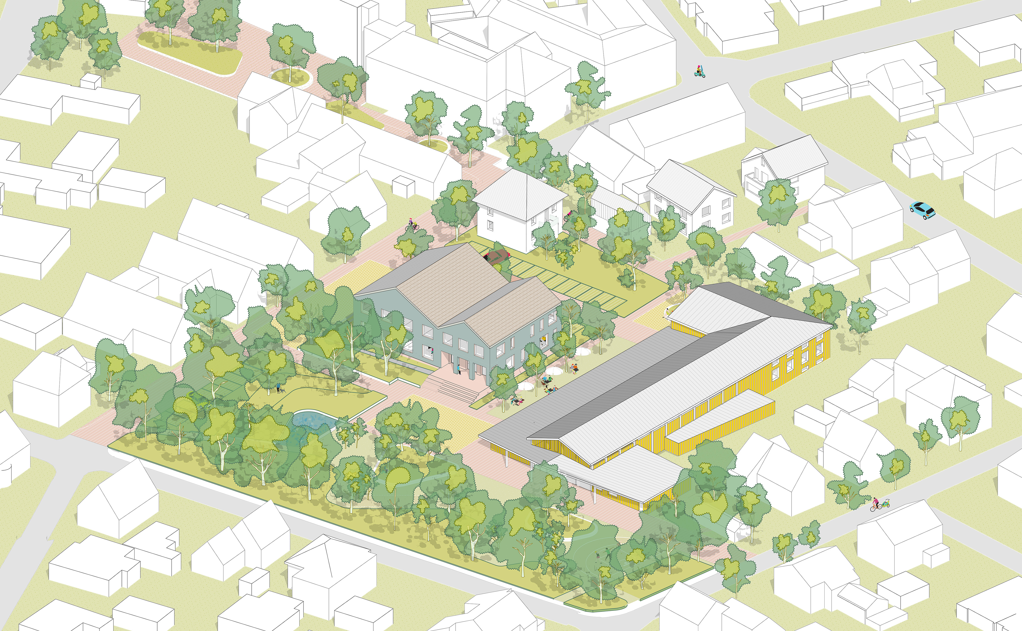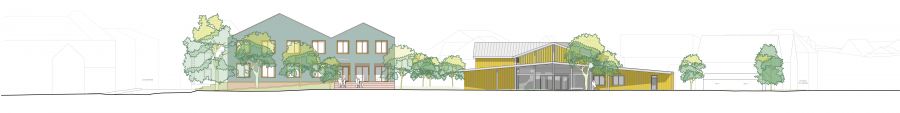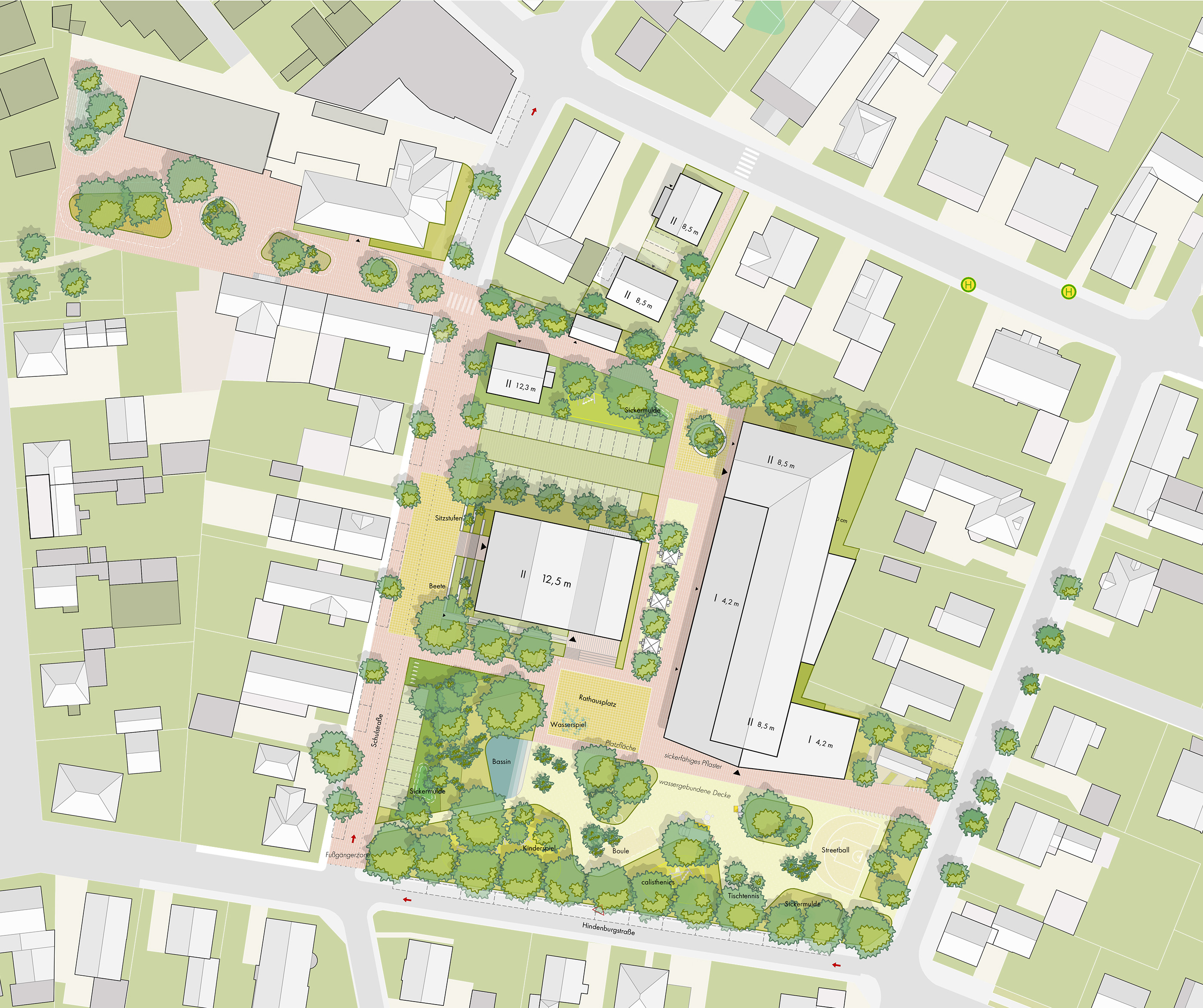 Die Ortsmitte wird zu einem barrierefreien, grünen und lebendigen Treffpunkt für alle Generationen umgestaltet. Drei neue Plätze verknüpfen Rathaus, Mehrzweckhalle, Schule und Bahnhof, bieten Raum für Veranstaltungen, Aufenthalt und Spiel und öffnen die Ortsmitte mit neuen Wegen zur Umgebung. Verkehrsberuhigte Straßen, neu geordnete Parkplätze und gut erreichbare Fahrradstellplätze erhöhen Sicherheit und Aufenthaltsqualität. Ein blau-grünes Infrastrukturkonzept mit Wasserbecken versickerungsfähigen Belägen und klimaresilienter Bepflanzung verbessert Mikroklima, Regenwasserbewirtschaftung und Biodiversität. Rathaus und Mehrzweckhalle werden funktional neu geordnet, barrierefrei erschlossen und durch neue Vorplätze klar adressiert, während Antonihaus und Bahnhofstraße 29 zusätzliche Räume für Bildung, Betreuung und Wohnen in zentraler Lage bieten.